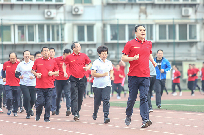 开幕式结束后,刘岷董事长带领高管团队为绿地泉阳光热身跑举行发令仪式并领跑,400多位绿地泉人一起用奔跑点燃了整个体育场。