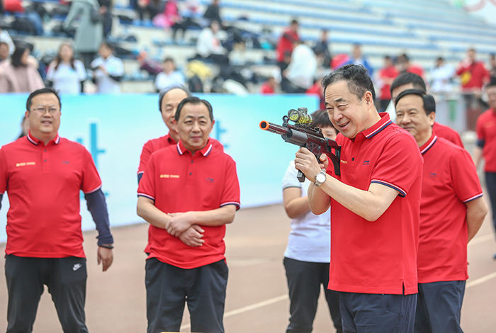 跑道终点设有百发百中项目,没想到跑完一圈的领导们个个都是神枪手,快速又精确的瞄准、射击引起观战员工们的阵阵高呼,也为一天精彩激烈的比赛正式拉开了序幕。