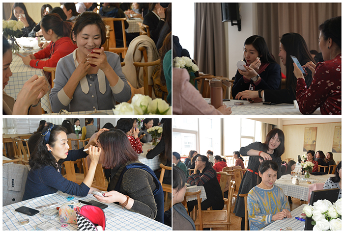 美妆讲座开始,何老师从理论入手,细心地为女神们讲授面部肌肉骨骼认知与色彩搭配、基础妆容的分解、生活妆、职场妆等不同妆容的化妆技巧。女神们踊跃担任实操环节的模特,从面部底妆、眼妆、面颊彩妆、唇妆、修容,到不同发型,何老师用熟练的动作一边演示一边讲解,从不带妆到带淡妆,简单的几个动作,整个人的气质就会有很大的提升,精气神和自信也随之而来了。听完何老师的讲解,众女神跃跃欲试,纷纷拿起工具为自己或者身边的伙伴化起妆来,一笔一划,细细描,轻轻画,欢声笑语中,转身回眸间,我们看到了更加自信的女神们。