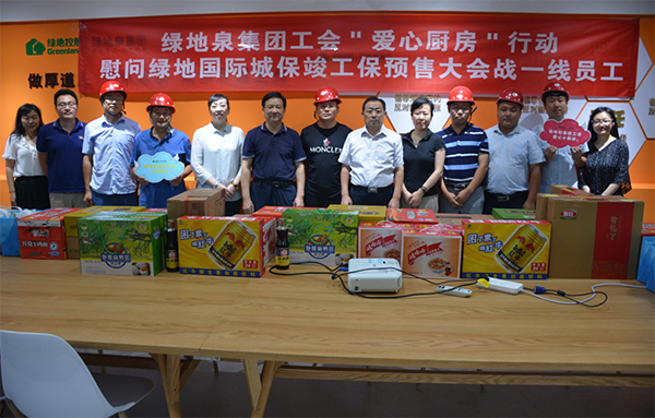 南部区域公司绿地国际城B9地块项目近期面临交付,同时新售楼处面临开放,为保竣工保预售,两项目团队人员驻扎工地现场展开会战,经常加班加点到深夜,靠方便面充饥。了解到现场工作人员就餐问题,绿地泉集团党委和工会决定开展“爱心厨房”行动,为项目一线员工送达特殊关爱。9月12日上午,绿地泉集团党委书记、常务副董事长刘栋,监事会、工会主席于洪星,总裁助理、成本合约中心总监张君一行代表来到南部区域公司慰问一线员工。