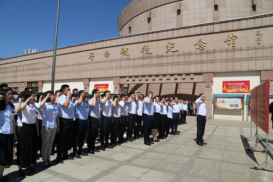 入党誓词是每一位共产党员对党和人民做出的庄严承诺。济南战役纪念馆前,在党委书记刘岷同志带领下,全体党员举起紧握的右拳,面对鲜红的党旗发出铮铮誓言“我志愿加入中国共产党,拥护党的纲领,遵守党的章程……”,重温入党誓词,始终铭记共产党员的神圣使命和担当。