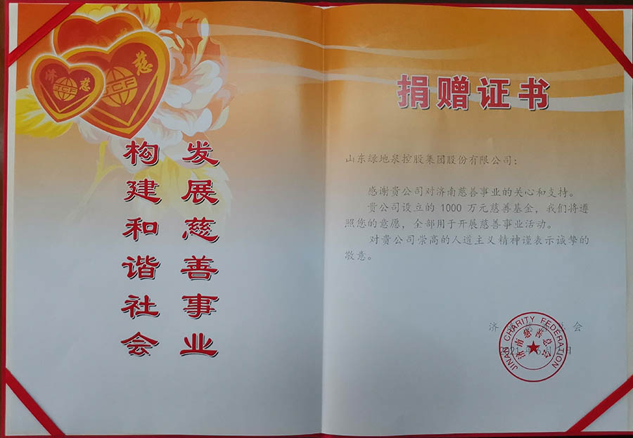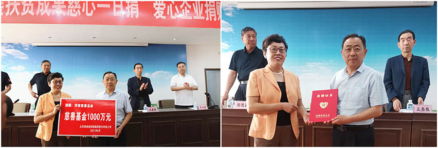 为巩固拓展扶贫攻坚成果,切实做好与乡村振兴的有效衔接,济南市慈善总会开展“巩固拓展扶贫攻坚成果 慈心一日捐”活动。6月2日上午,爱心企业捐赠仪式在济南市慈善总会大会议室举行,济南市慈善总会会长徐明梅,副会长王嘉振、田德昌、李心宏等及认捐企业代表和个人参加会议。山东绿地泉控股集团纪委书记,监事会、工会主席于洪星参加仪式,代表绿地泉集团向济南市慈善总会捐赠1000万元爱心慈善基金,并接收《捐赠证书》。