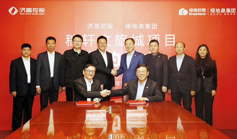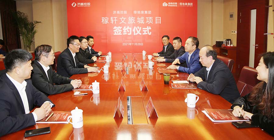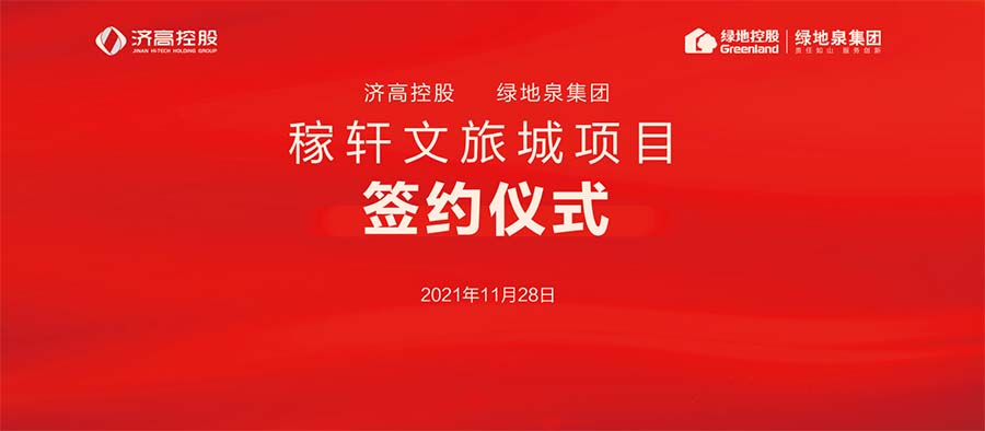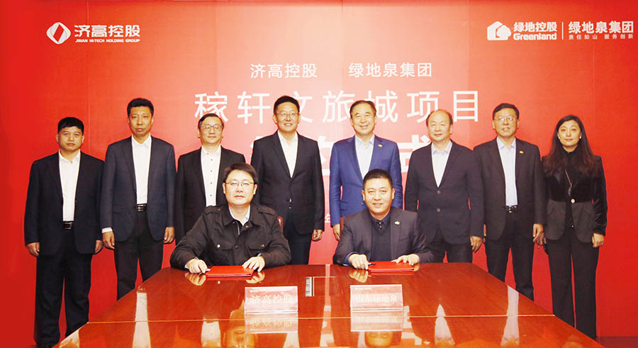 近日,山东绿地泉控股集团与济南高新控股集团在泉景鸿园商务大厦签署《稼轩文旅城项目合作框架协议》和《稼轩文旅城项目一期合作协议》,合作开发济南稼轩文旅城项目。高新区党工委委员、管委会副主任,济高控股党委书记、董事长李昊,高新区管委会主任助理,集团党委副书记、总经理孙萌,济高控股党委委员、副总经理,济高临空公司董事长王祖垒,济高控股总经理助理、发展规划部部长,济高东拓公司总经理吴宝健,济高临空公司副总经理王化新,山东绿地泉控股集团董事长、党委书记、总裁刘岷,执行总裁辛勇,副总裁万成粮,董事长助理马建平等出席签约仪式。